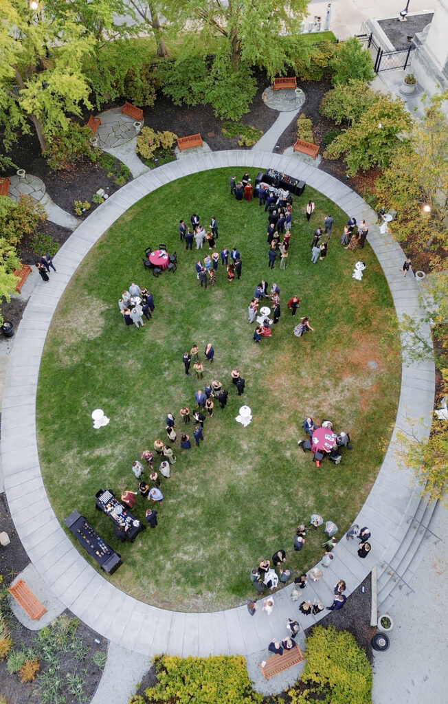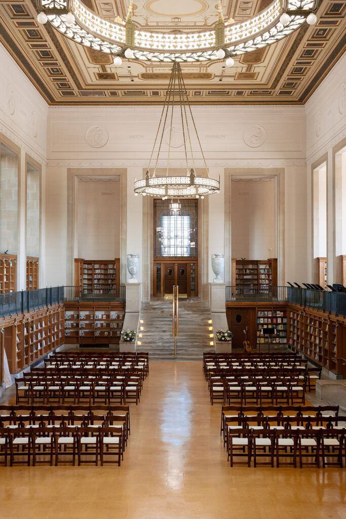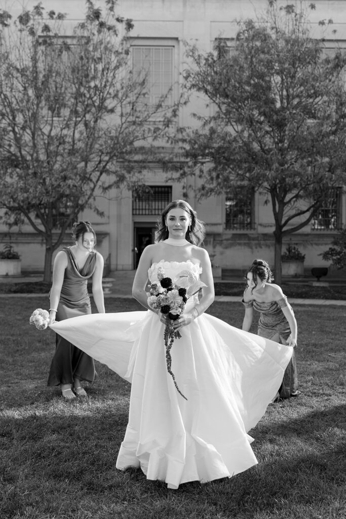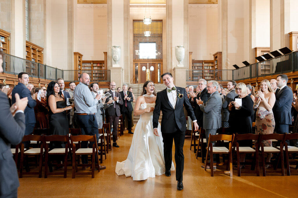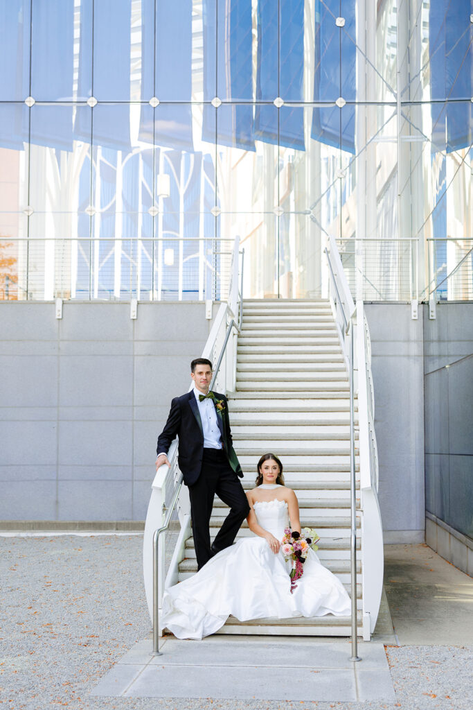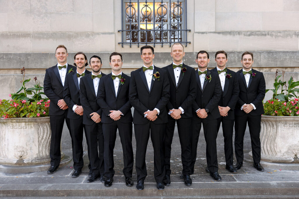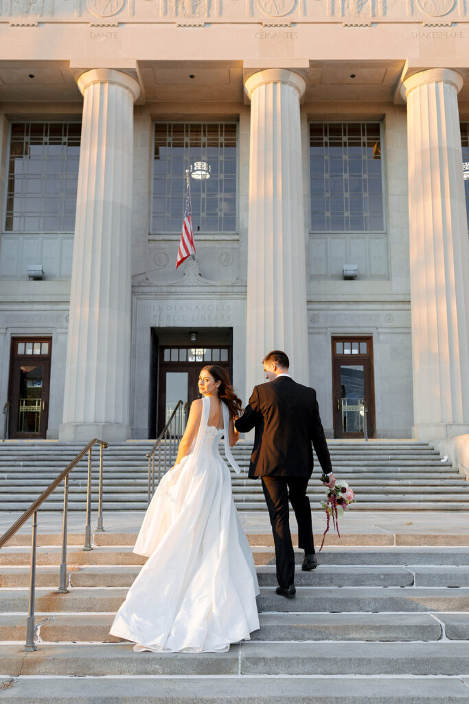 The parties then arrived at the Indianapolis Central Library for their first look and group photos in the stunning courtyard. Surrounded by the library’s grand architecture and sweeping views of downtown, the space offered the perfect mix of urban elegance and timeless romance. From stories above, the soaring atrium windows provided a bird’s-eye view of the courtyard below — a breathtaking scene beautifully captured by photographer Gretchen Wittry.