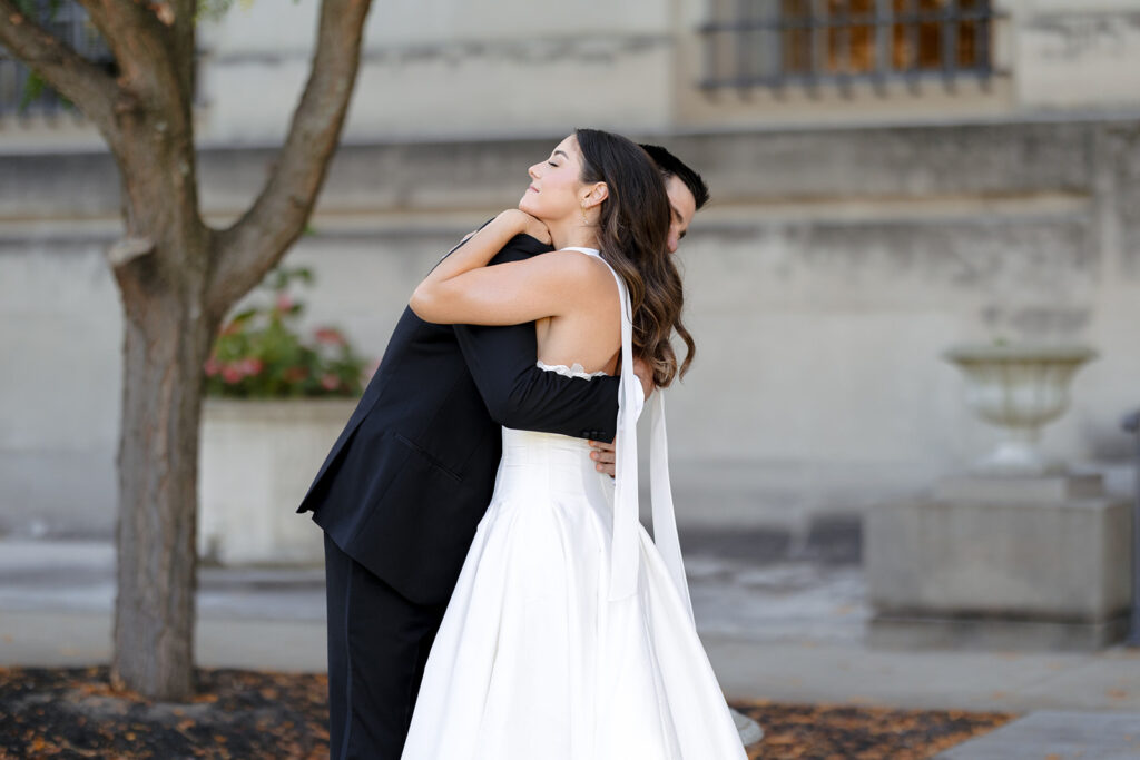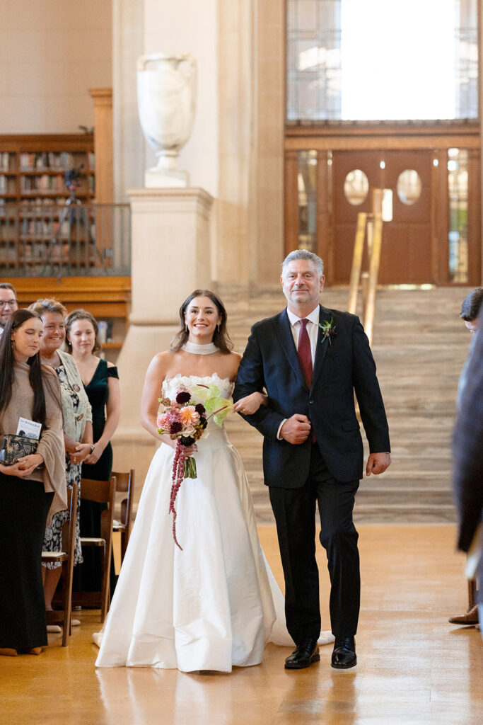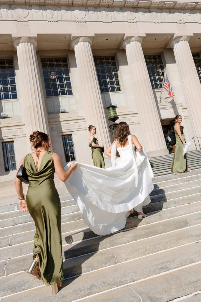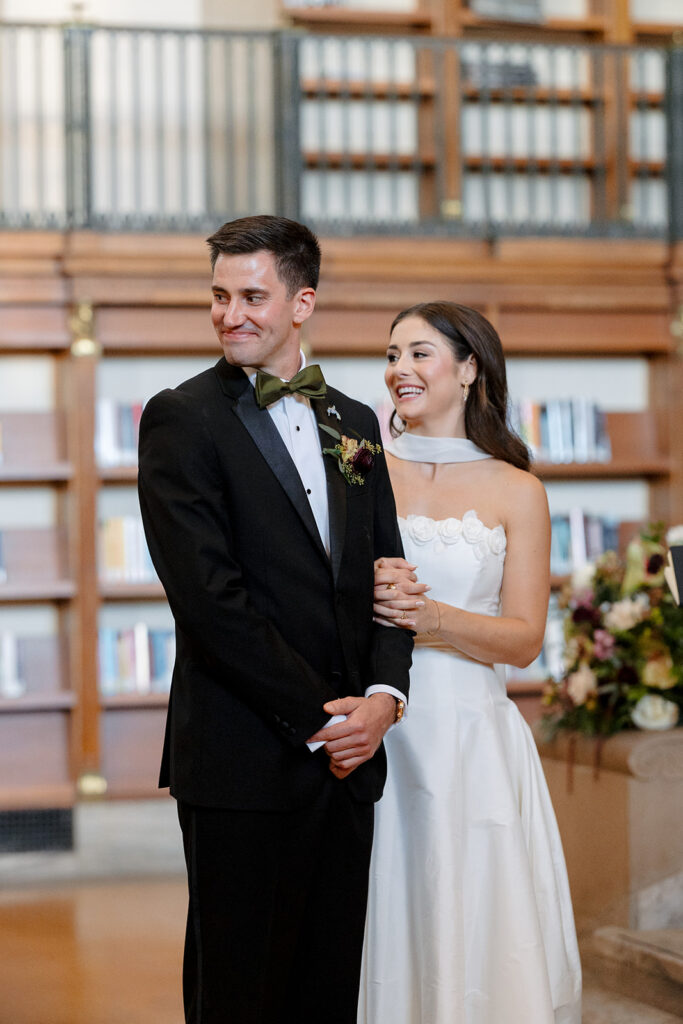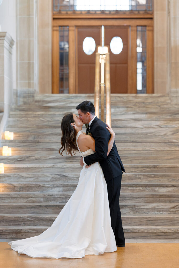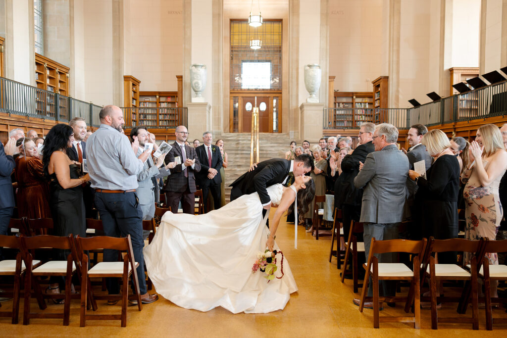 The parties then arrived at the Indianapolis Central Library for their first look and group photos in the stunning courtyard. Surrounded by the library’s grand architecture and sweeping views of downtown, the space offered the perfect mix of urban elegance and timeless romance. From stories above, the soaring atrium windows provided a bird’s-eye view of the courtyard below — a breathtaking scene beautifully captured by photographer Gretchen Wittry.