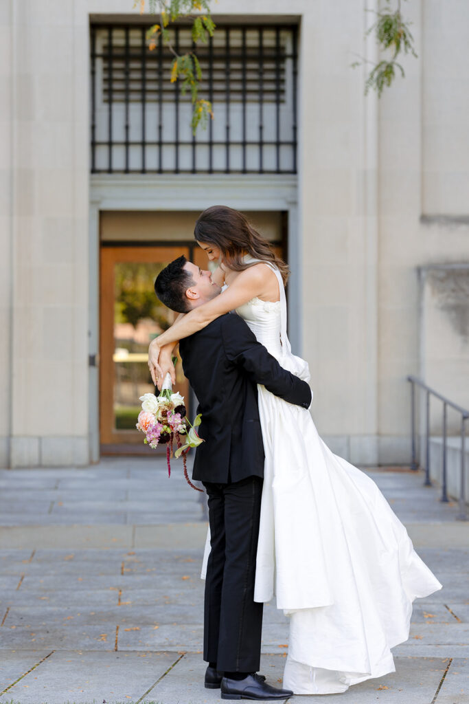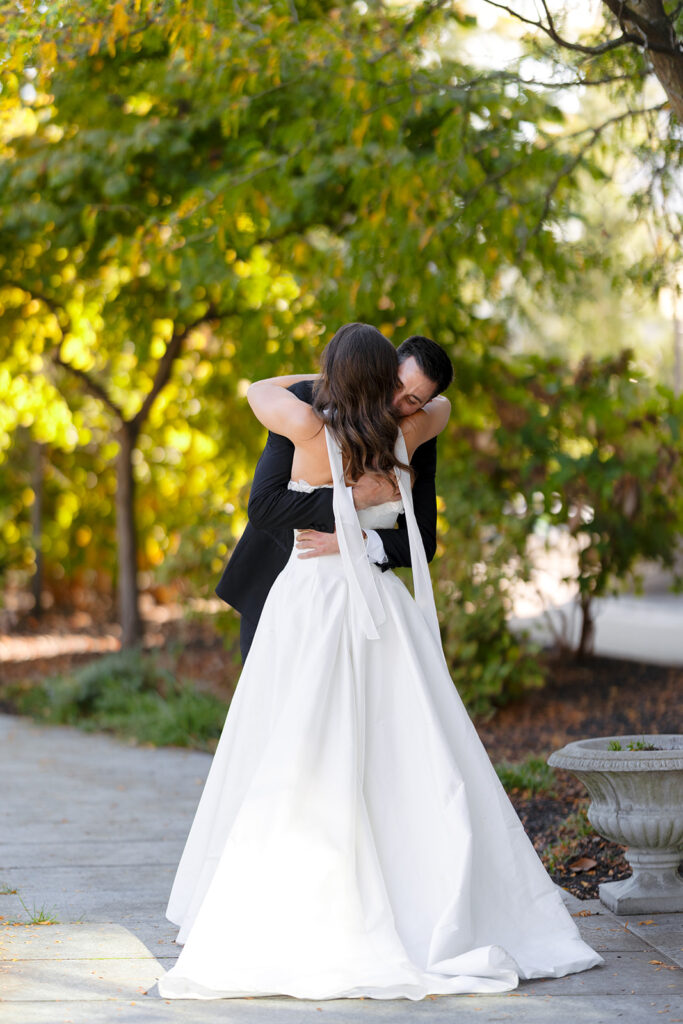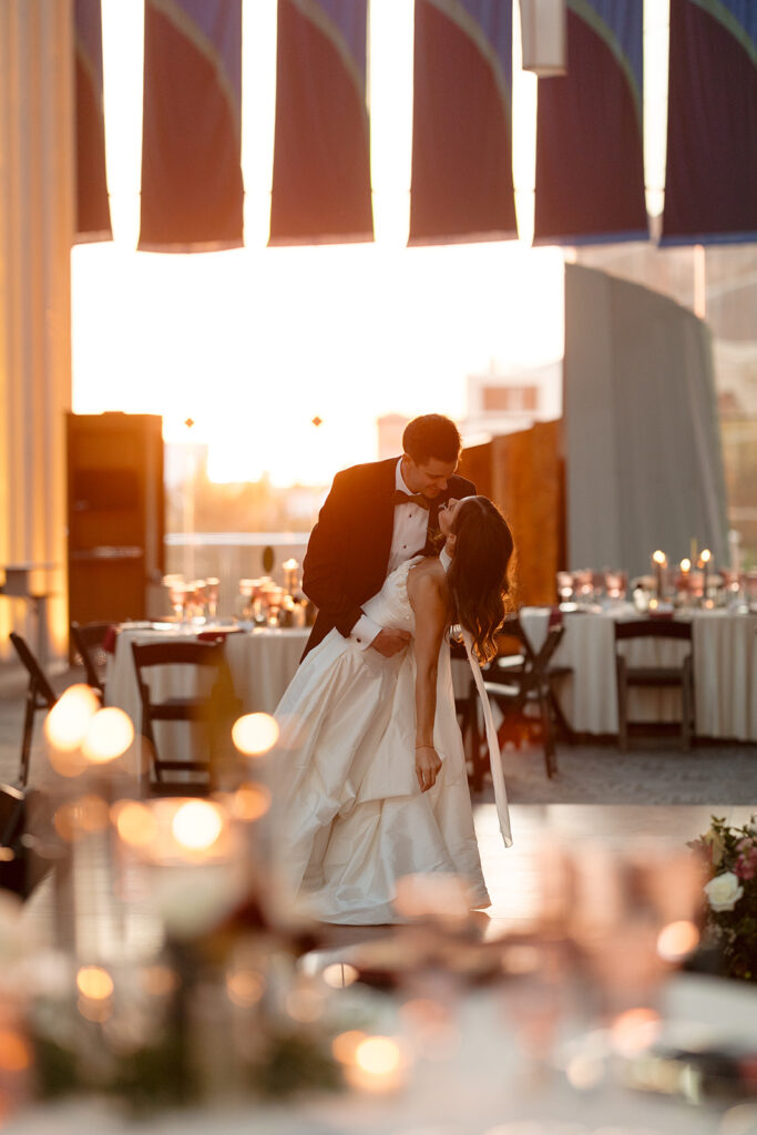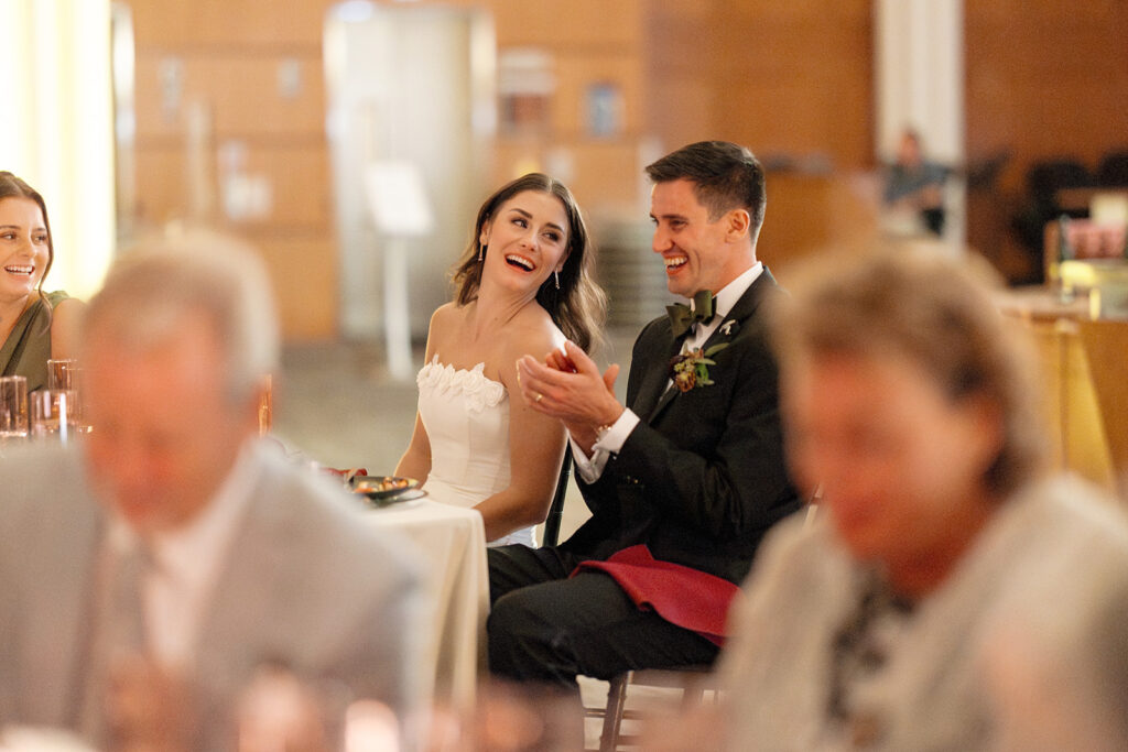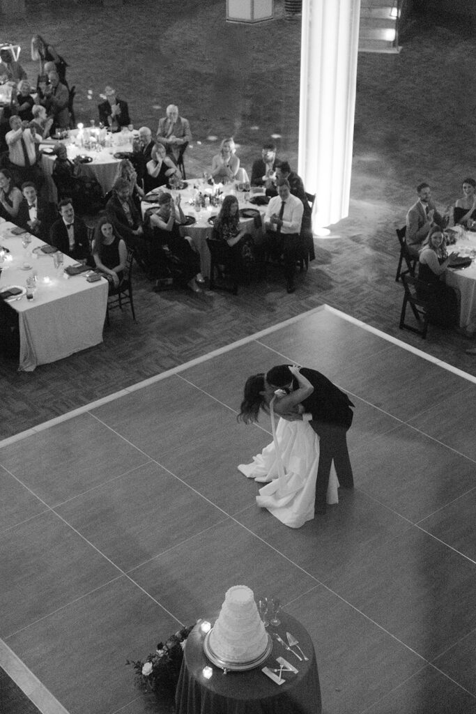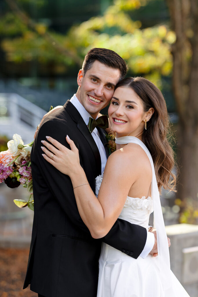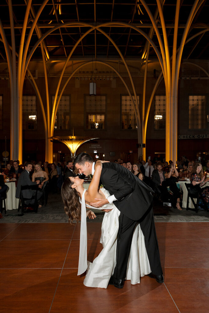 The parties then arrived at the Indianapolis Central Library for their first look and group photos in the stunning courtyard. Surrounded by the library’s grand architecture and sweeping views of downtown, the space offered the perfect mix of urban elegance and timeless romance. From stories above, the soaring atrium windows provided a bird’s-eye view of the courtyard below — a breathtaking scene beautifully captured by photographer Gretchen Wittry.