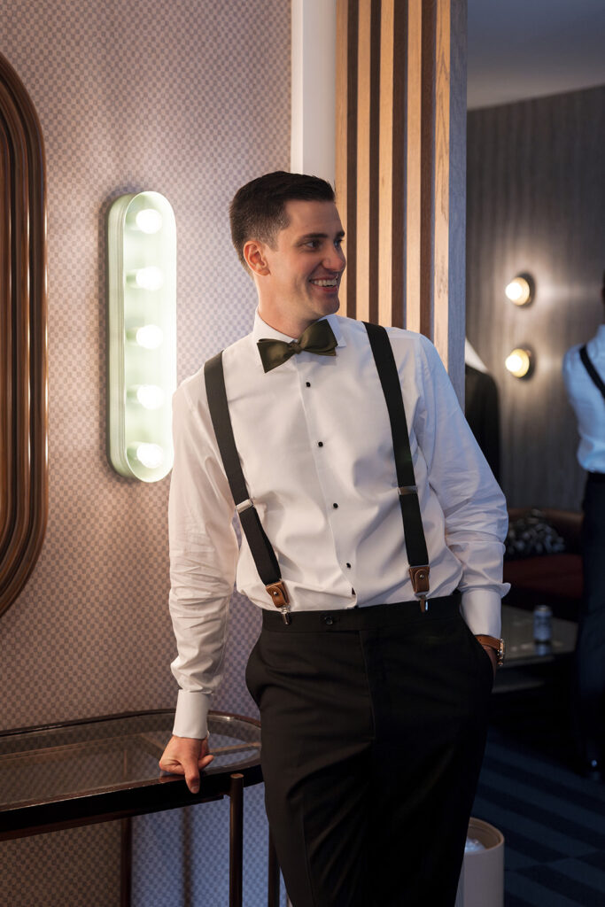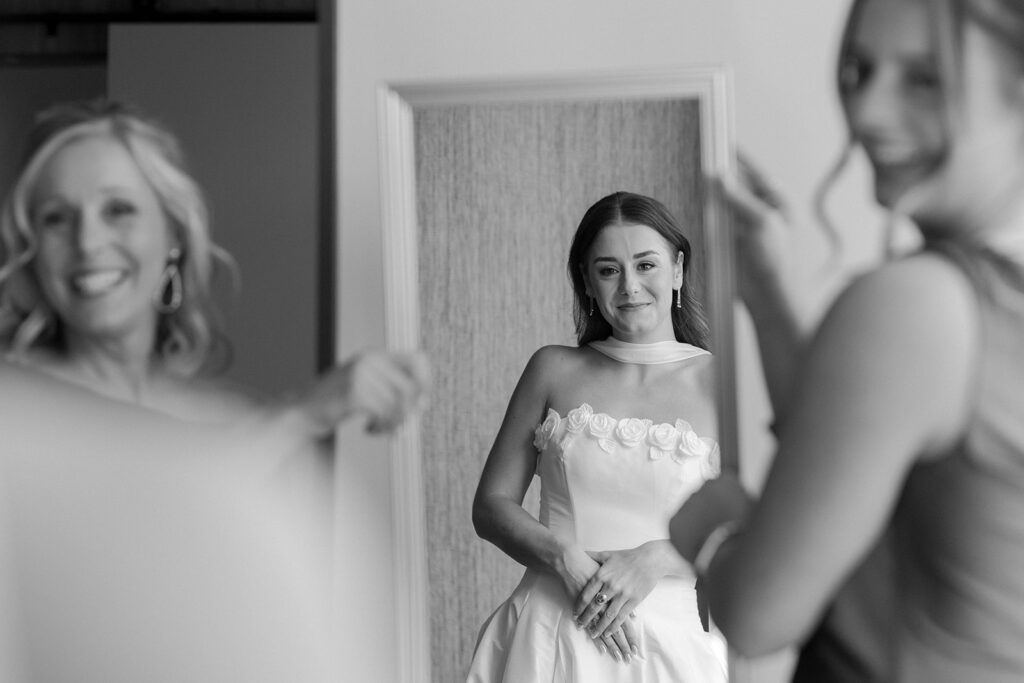 The day began at Hotel Indy, a stylish mid-century boutique hotel in downtown Indianapolis. It was the perfect spot for a relaxed yet elevated morning as the bridal party sipped mimosas, shared laughter, and took stunning pre-wedding photos on the rooftop with the city skyline as their backdrop.