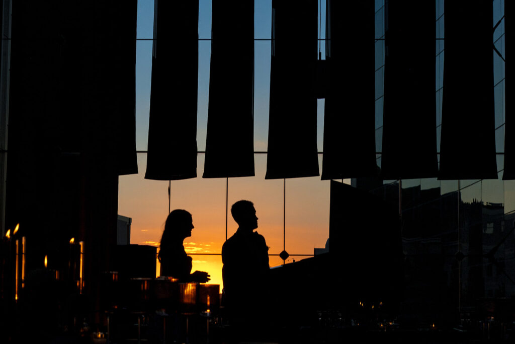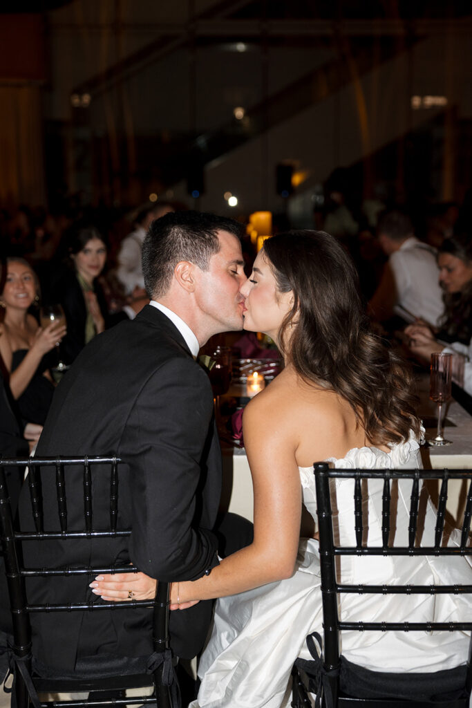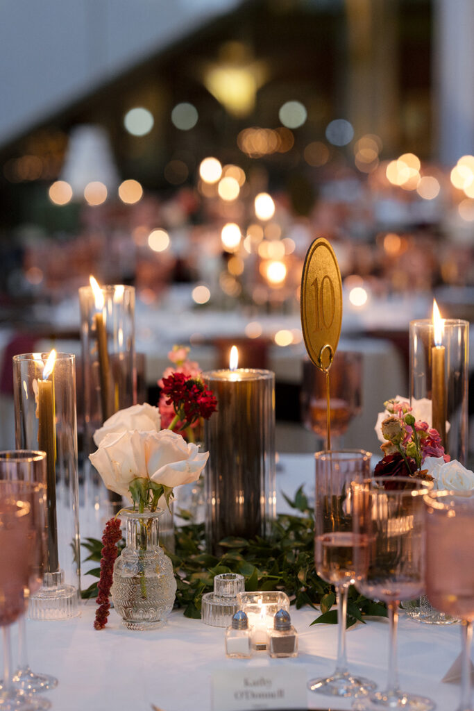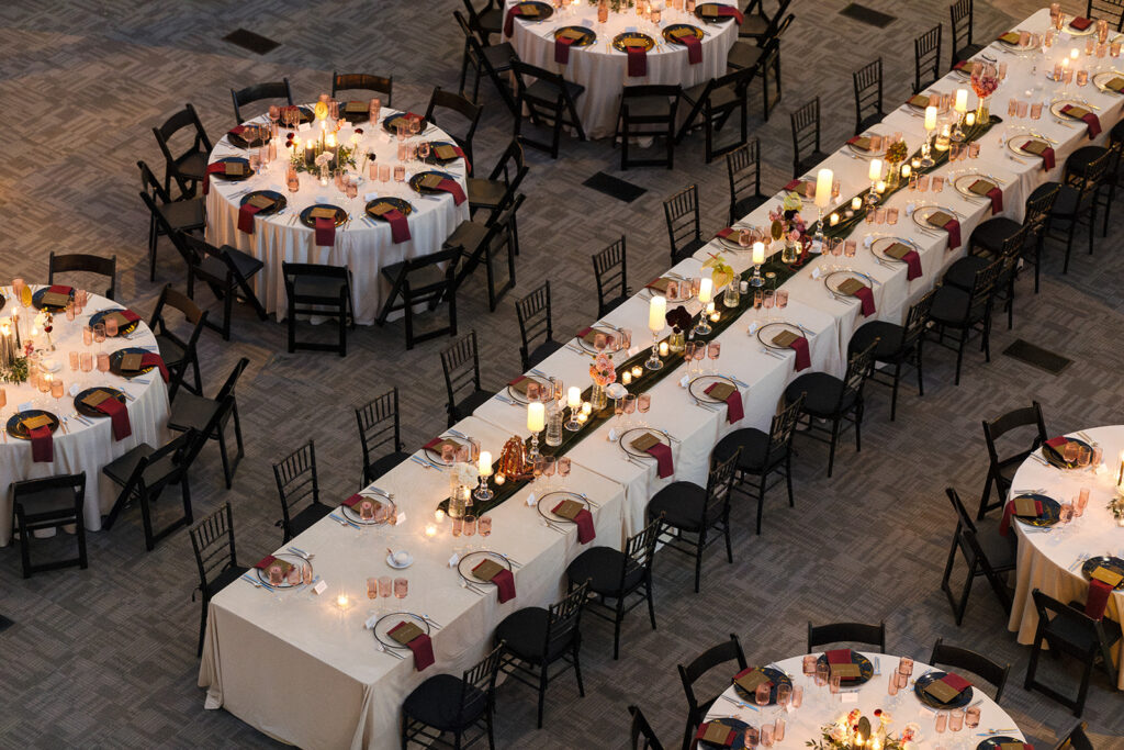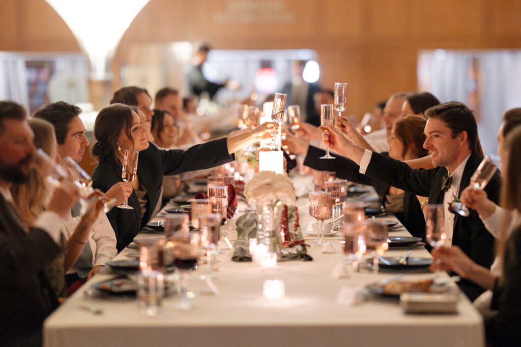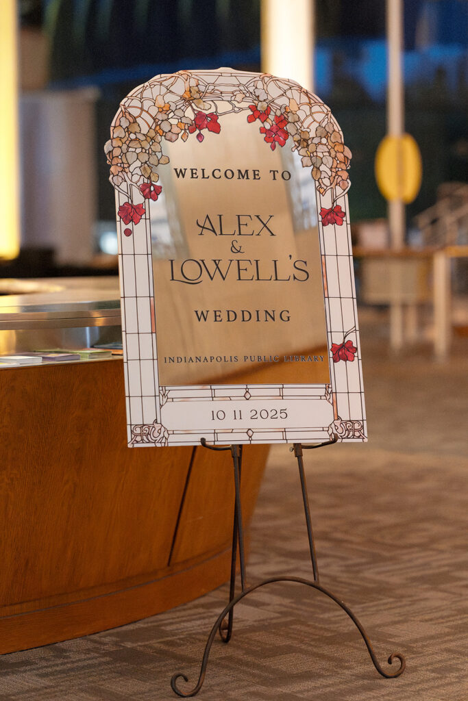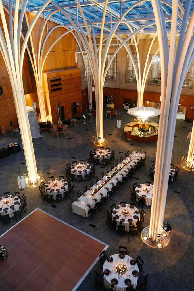 The reception took place in the iconic atrium of the Indianapolis Central Library, where the setting sun streamed through the towering glass windows, making the pink glasses glisten and filling the space with a warm golden glow.