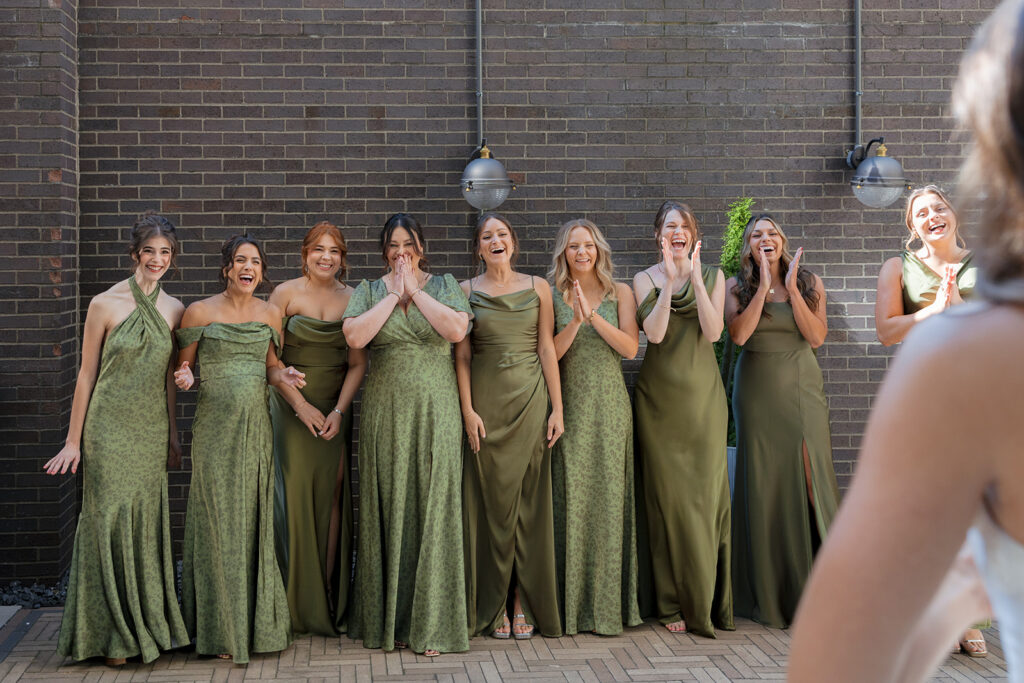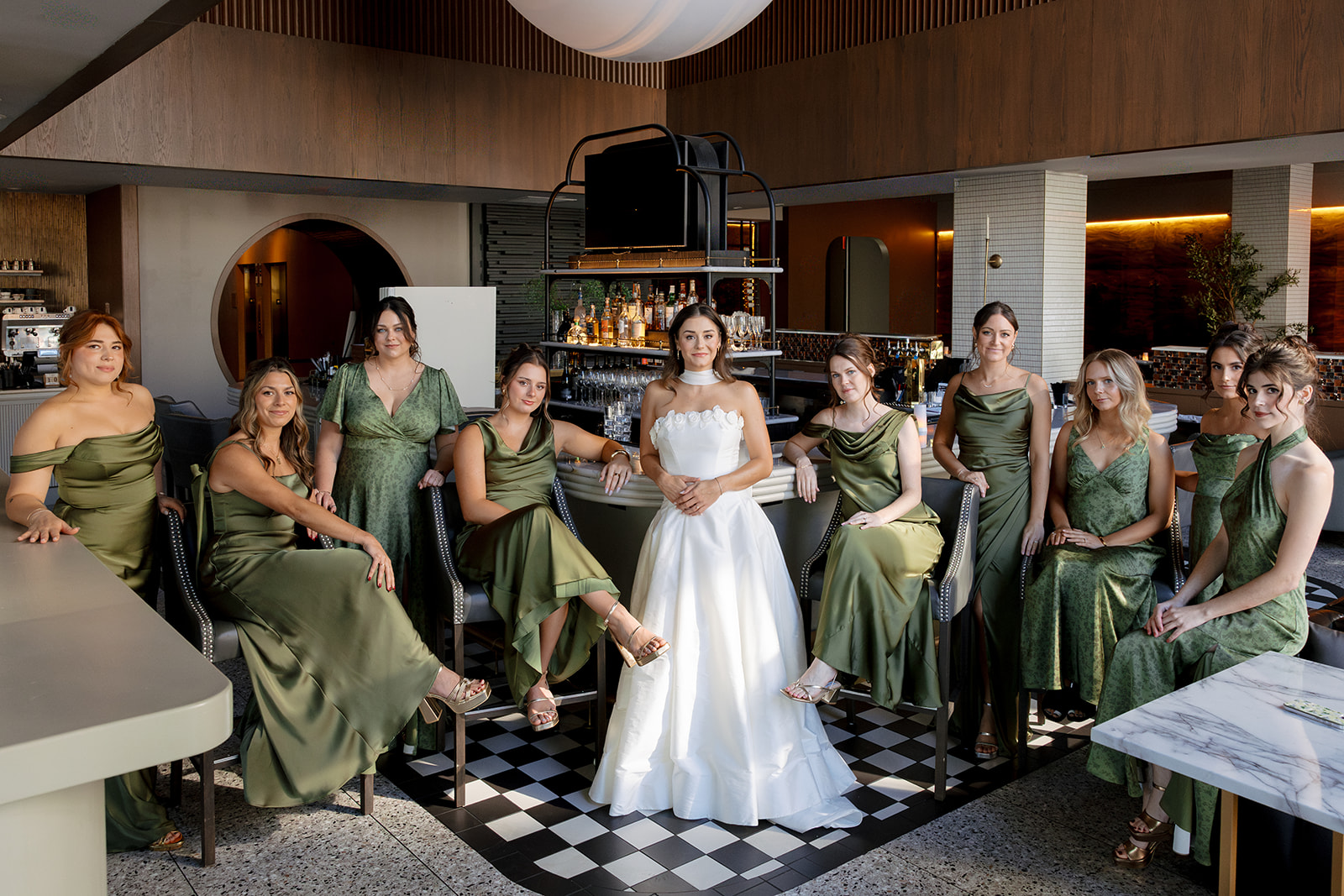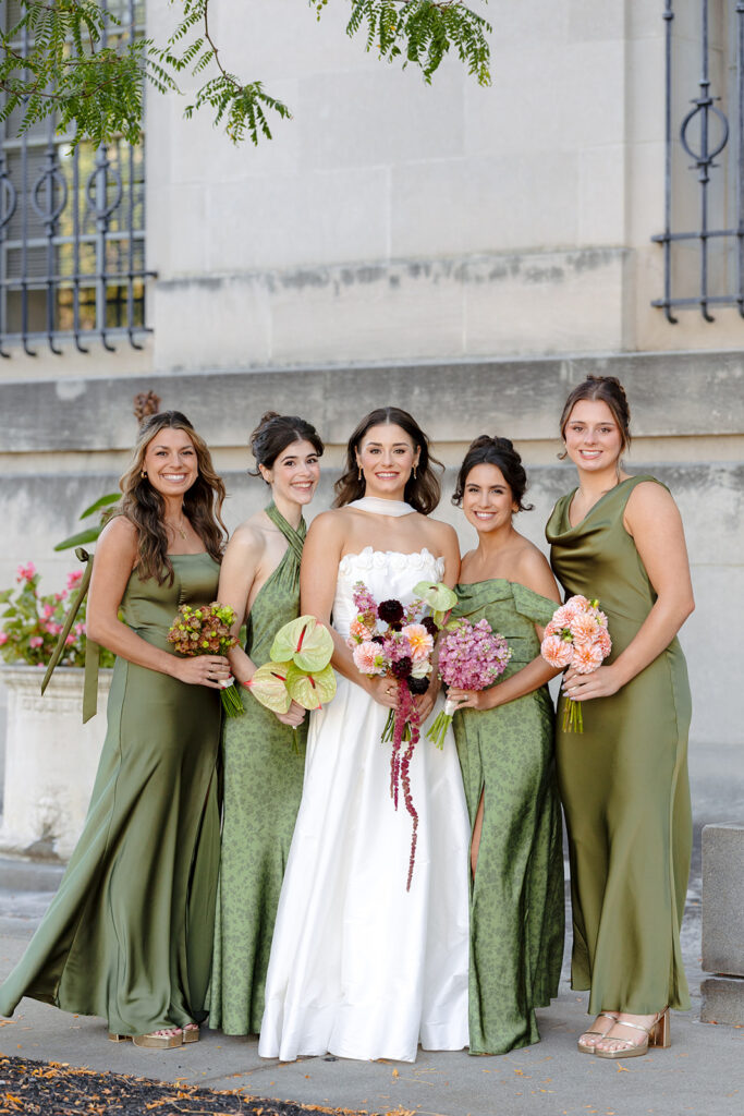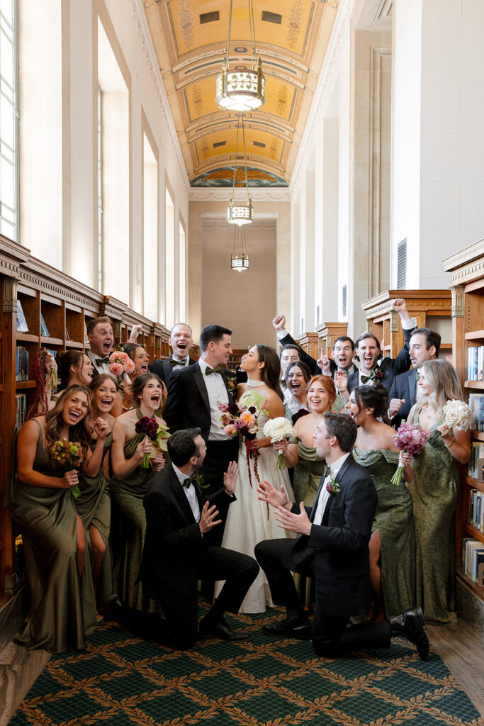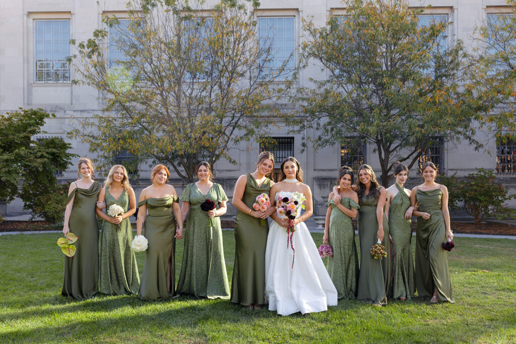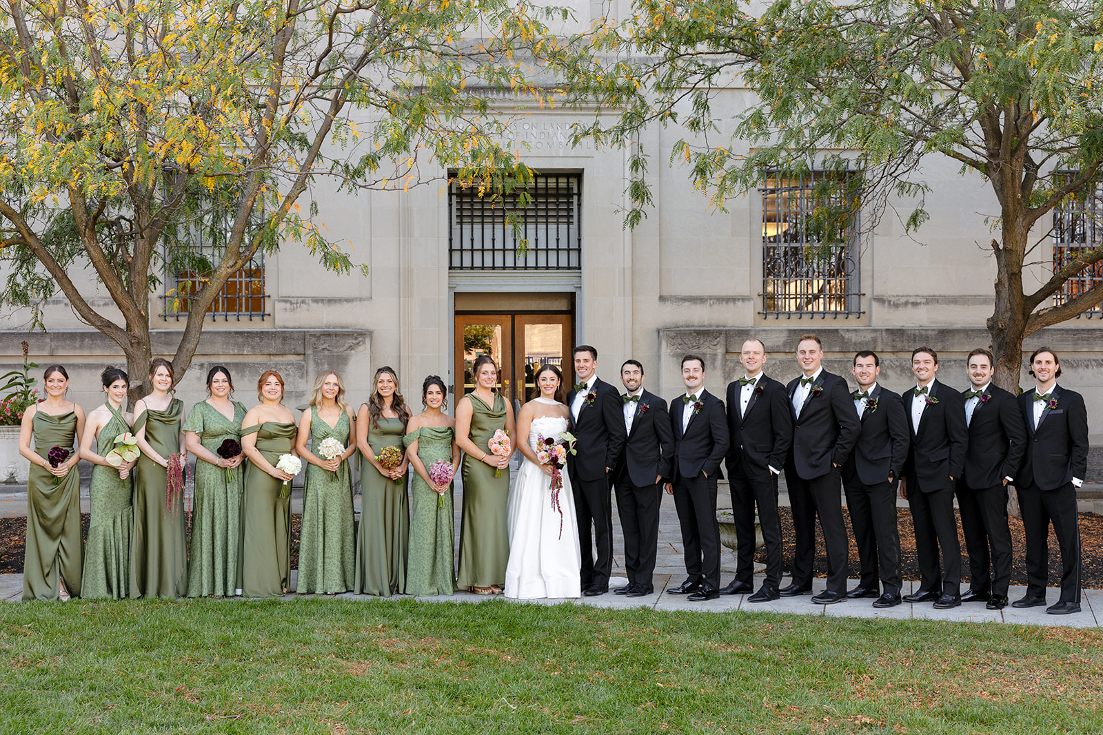 Step inside this stunning October wedding at the Indianapolis Central Library featuring a vintage-inspired palette of moss green, burgundy, and blush. Bridesmaids dazzled in elegant green gowns, pink glassware adorned the tables, and every detail reflected timeless fall romance in the heart of downtown Indianapolis.